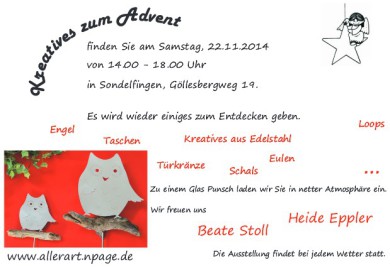 Adventsausstellung - Kreatives zum Advent - am 22.11.2014 in Reutlingen-Sondelfingen, Göllesbergweg 19 von 14:00 bis 18:00 Uhr. Sie sind herzlich eingeladen.